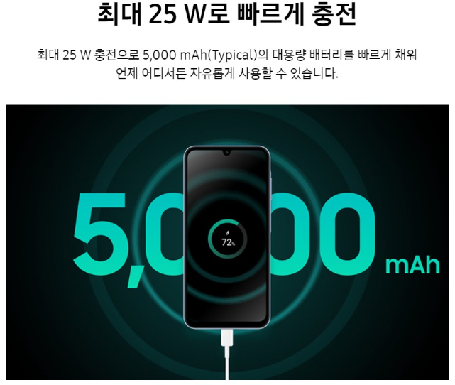 갤럭시 A25는 5000mAh의 대용량 배터리를 탑재하여 장시간 사용이 가능합니다. 한 번 충전으로 하루 종일 사용할 수 있으며, 갤럭시 A25는 고속 충전을 지원하여 짧은 시간 내에 배터리를 충전할 수 있습니다. 이는 특히 바쁜 일상 속에서 매우 유용한 기능입니다.