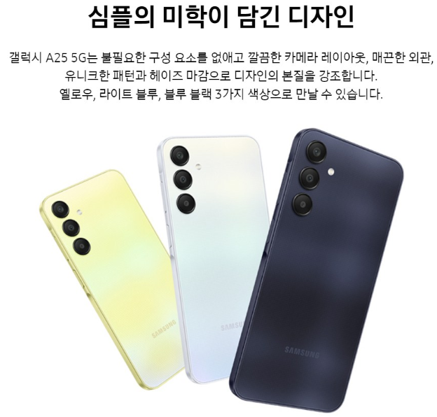 갤럭시 A25는 세련된 디자인과 다양한 색상 옵션을 제공하여 사용자에게 스타일리시한 선택을 제공합니다. 슬림한 디자인과 가벼운 무게는 휴대성을 높여주며, 고급스러운 마감 처리는 한층 더 높은 품질감을 느끼게 합니다.
