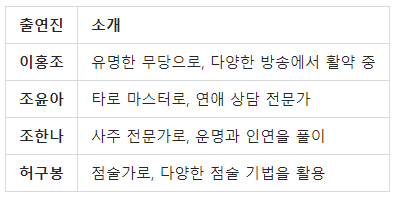 '신들린 연애'는 무당 타로 사주 전문가들이 출연하여 연애와 운명을 풀어가는 신박한 예능 프로그램입니다. 이 글에서는 '신들린 연애'의 출연진 정보와 프로그램의 매력을 소개해보겠습니다.