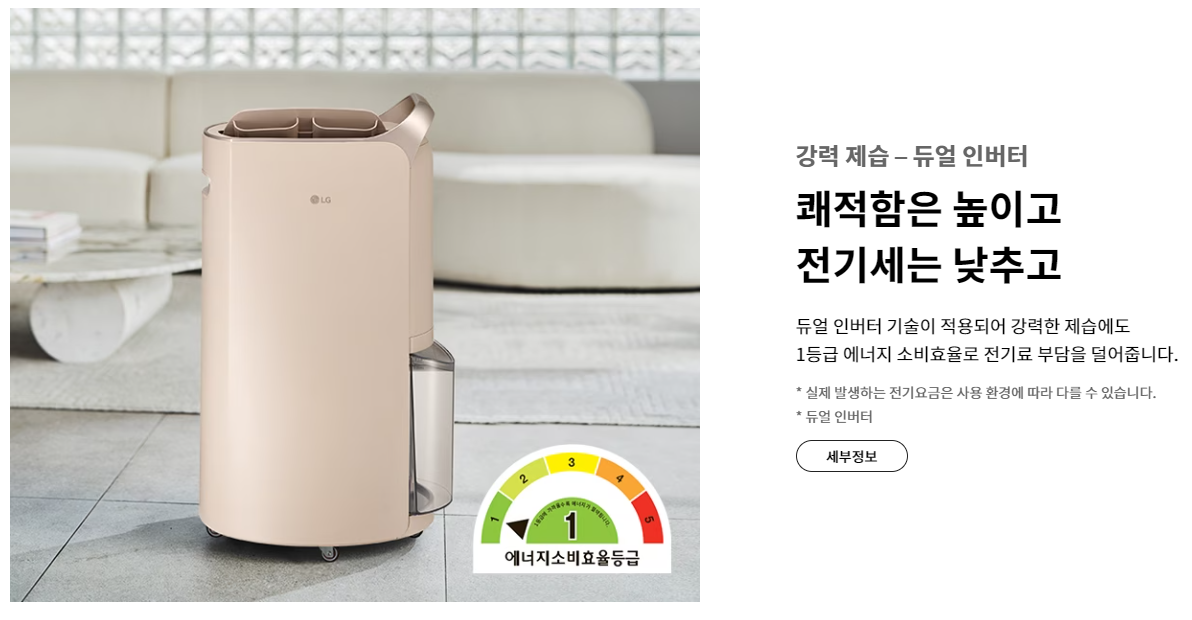 LG 휘센 오브제컬렉션 제습기 DQ203PECA는 에너지 효율 1등급 제품으로, 전력 소모를 최소화하여 경제적인 사용이 가능합니다. 또한, 친환경적인 인버터 방식을 채택하여 소음도 적고, 오래 사용해도 안정적인 성능을 유지합니다.