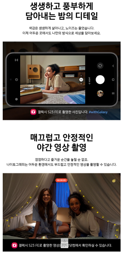 갤럭시 S23 FE의 카메라는 주광과 저조도 모두에서 뛰어난 사진 품질을 제공합니다. 5,000만 화소의 메인 카메라와 800만 화소의 망원 카메라, 1,200만 화소의 초광각 카메라는 다양한 촬영 상황에서 우수한 결과물을 제공합니다. 특히, 나이토그래피 기능을 통해 어두운 환경에서도 선명한 사진을 촬영할 수 있습니다.