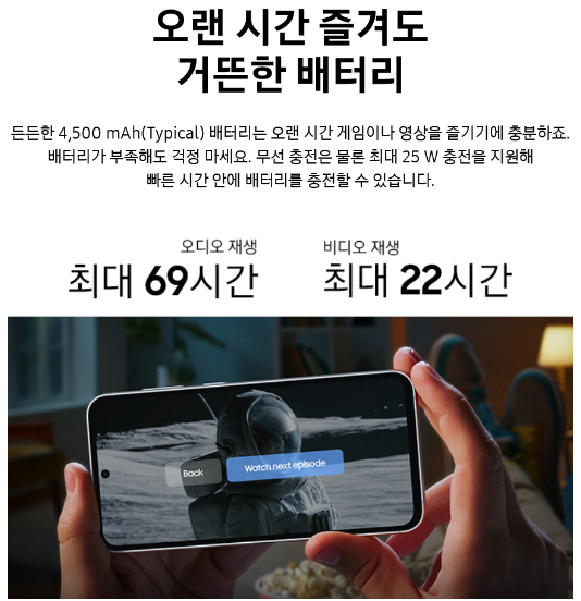 갤럭시 S23 FE는 4,500mAh의 배터리는 하루 종일 사용해도 충분한 용량을 자랑합니다. 빠른 충전 기능을 통해 짧은 시간 내에 배터리를 충전할 수 있어, 바쁜 일상 속에서도 편리하게 사용할 수 있습니다.